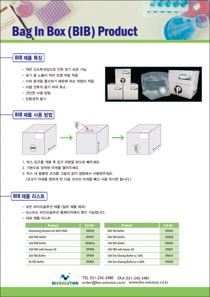 Bag In Box Bulk 제품 안내 작성자 biosolution 작성일 2022-12-01 20:31 조회 757 좋아요 0 싫어요 0 인쇄 « Easy Stick Buffer SAFELOAD Serise - Safer Alternateivs to Ethiudium Bromide (EtBr) » 목록보기 Powered by KBoard